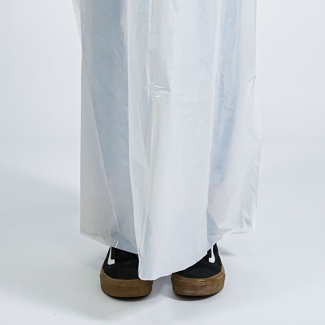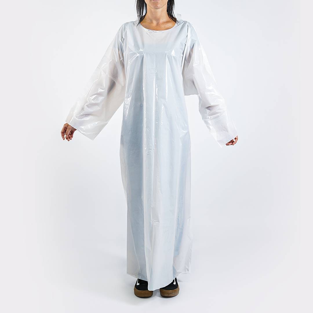 Disposable overcoats made of white polyethylene with long sleeves - length about 140 cm.